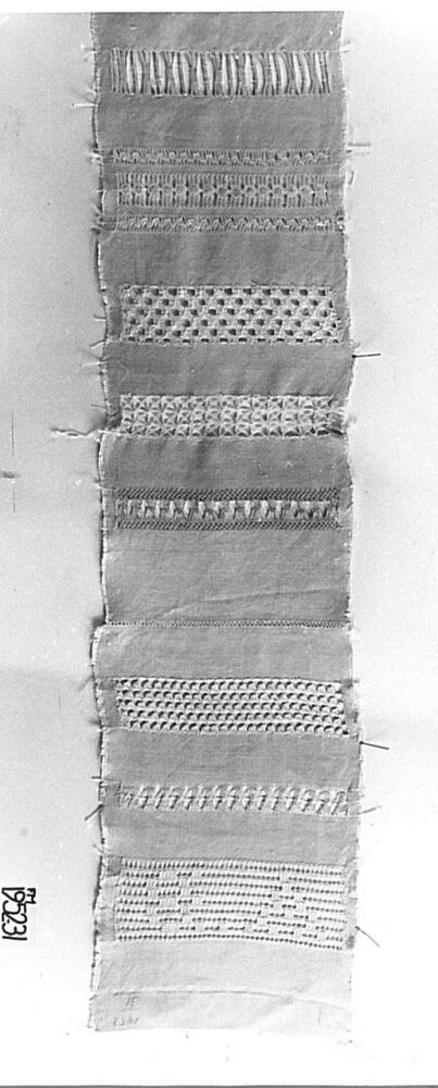 Grote lange smalle lap waarop diverse patronen van open naaiwerkverwerkt als proef van bekwaamheid