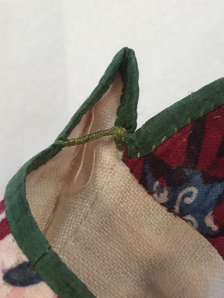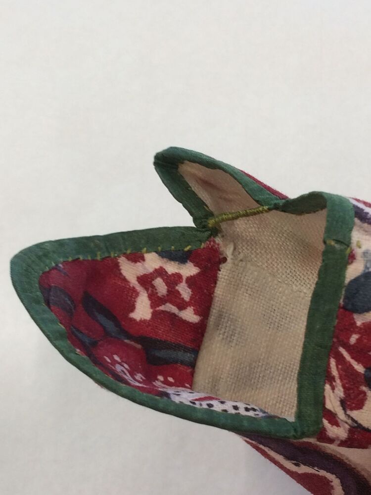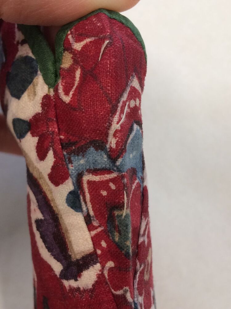 Sitsen kindermitaines met aangenaaid duimpje, met medaillons op rode grond