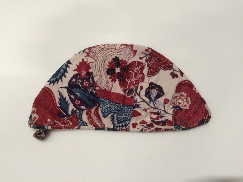 Sitsen meisjesmuts, fragment van motief met granaatappels en fantasie bloemen op witte grond
