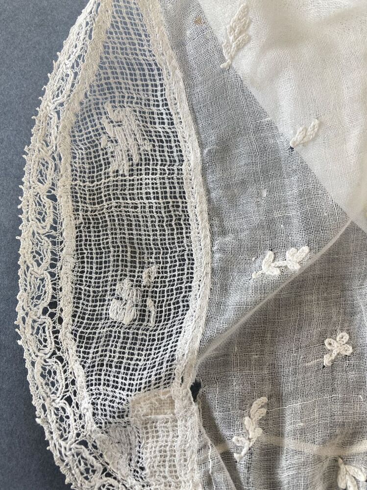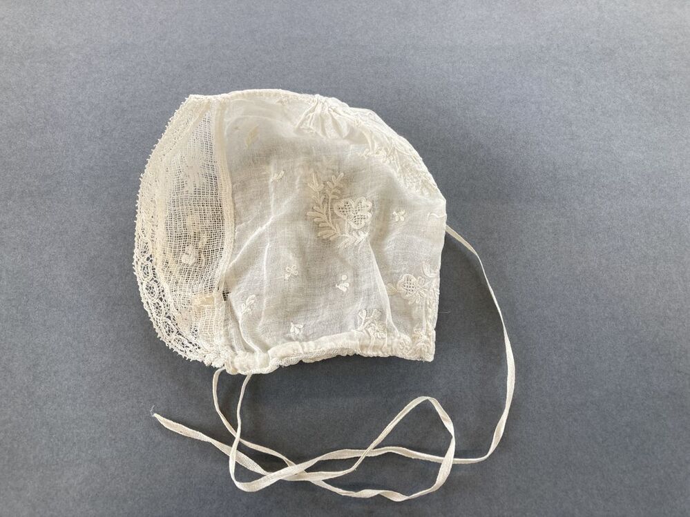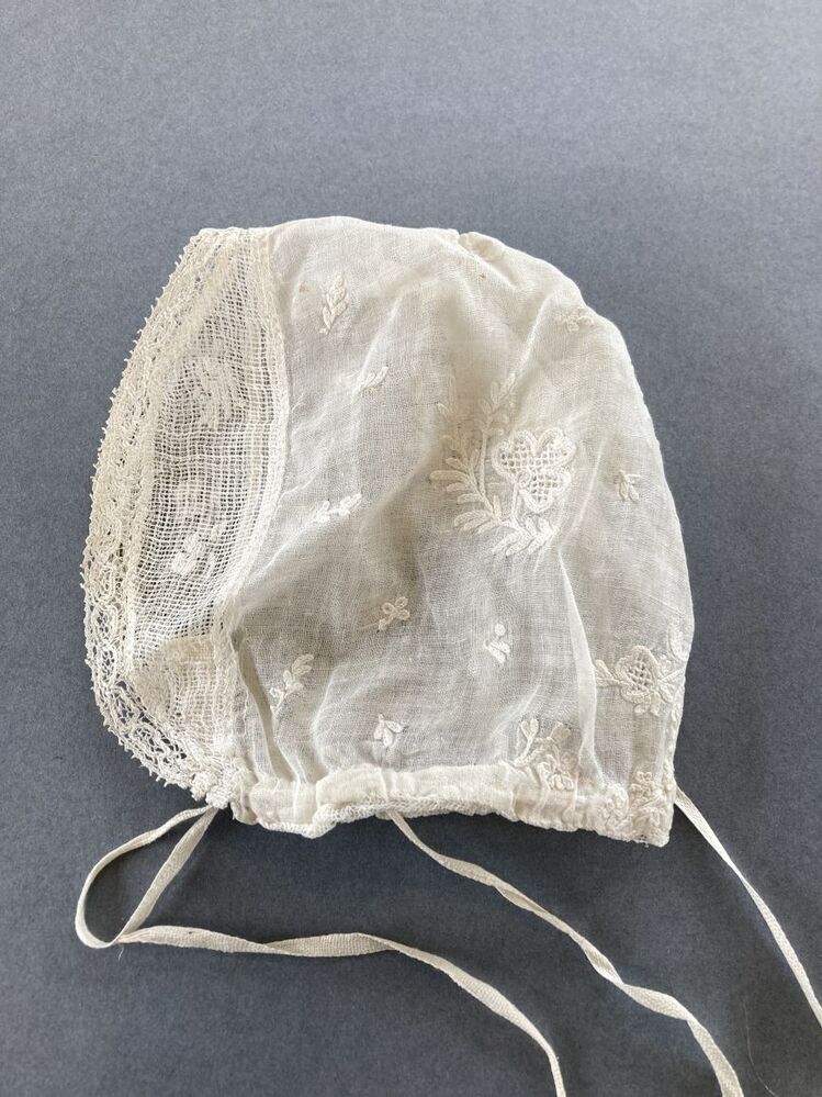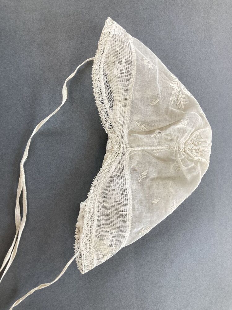 Kindermutsje van witte getamboereerde batist met gebogen gezichtstrook afgezet met kloskantje