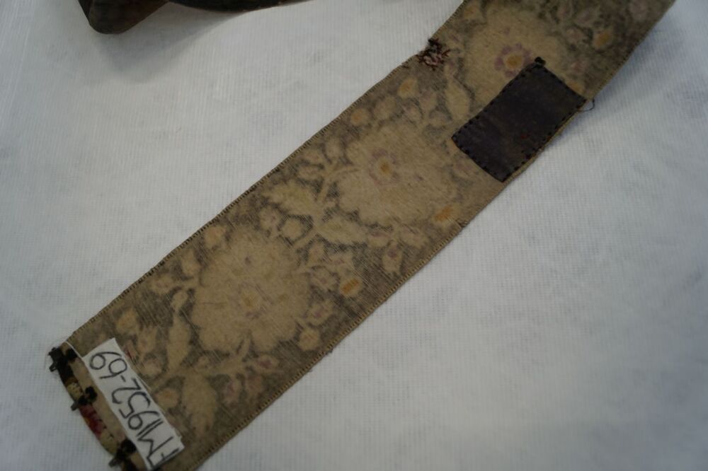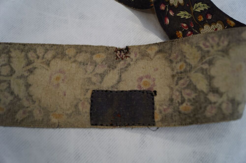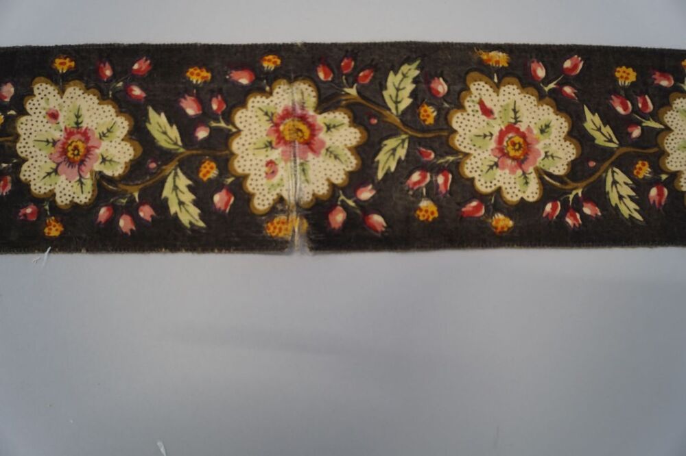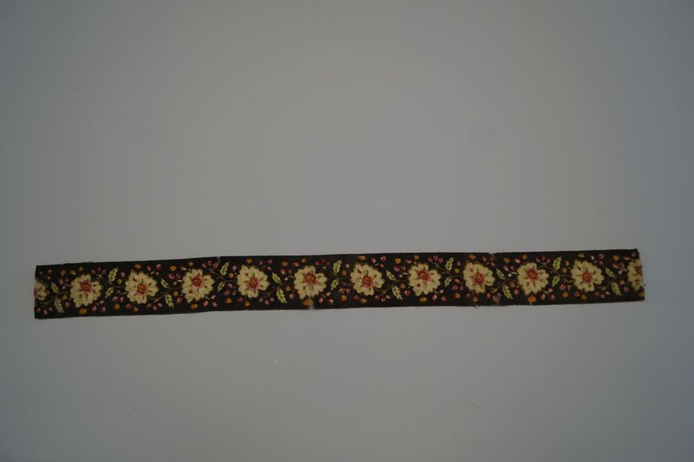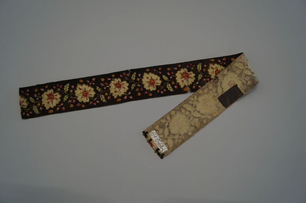 Ceintuur van een zijden lint met zwart fond en bedrukt met veelkleurige tak