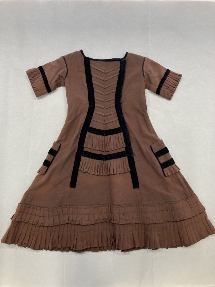 Bruine wollen serge, kinderjurk, afgezet met bruin fluweel.