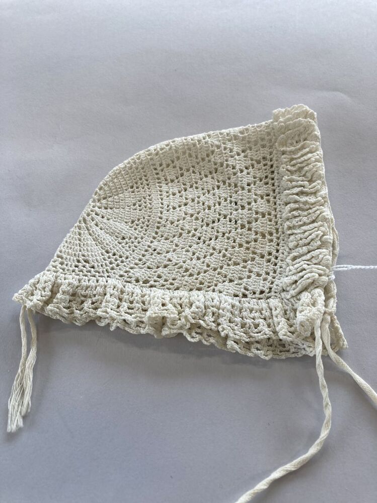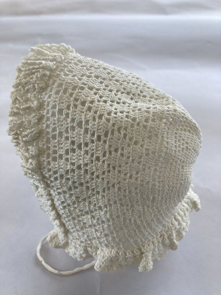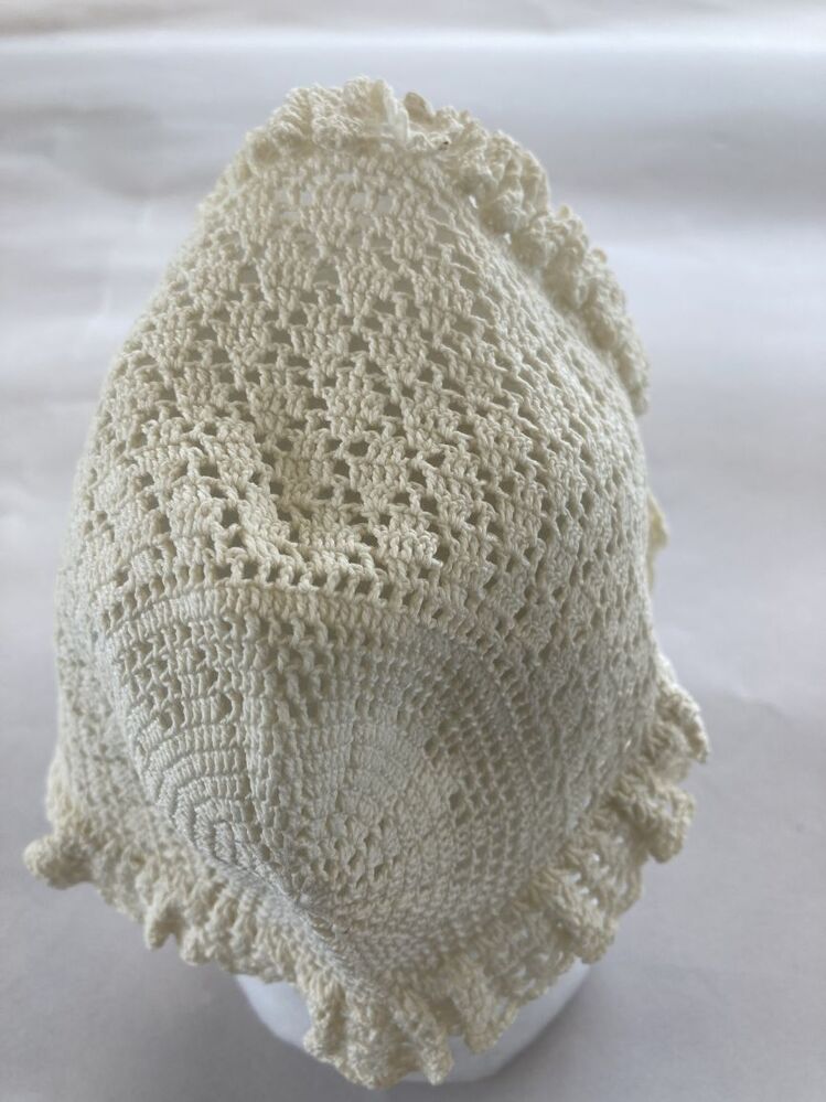 Wit katoenen gehaakt meisjesmutsje, in 1883 zelf gehaakt door de schenkster