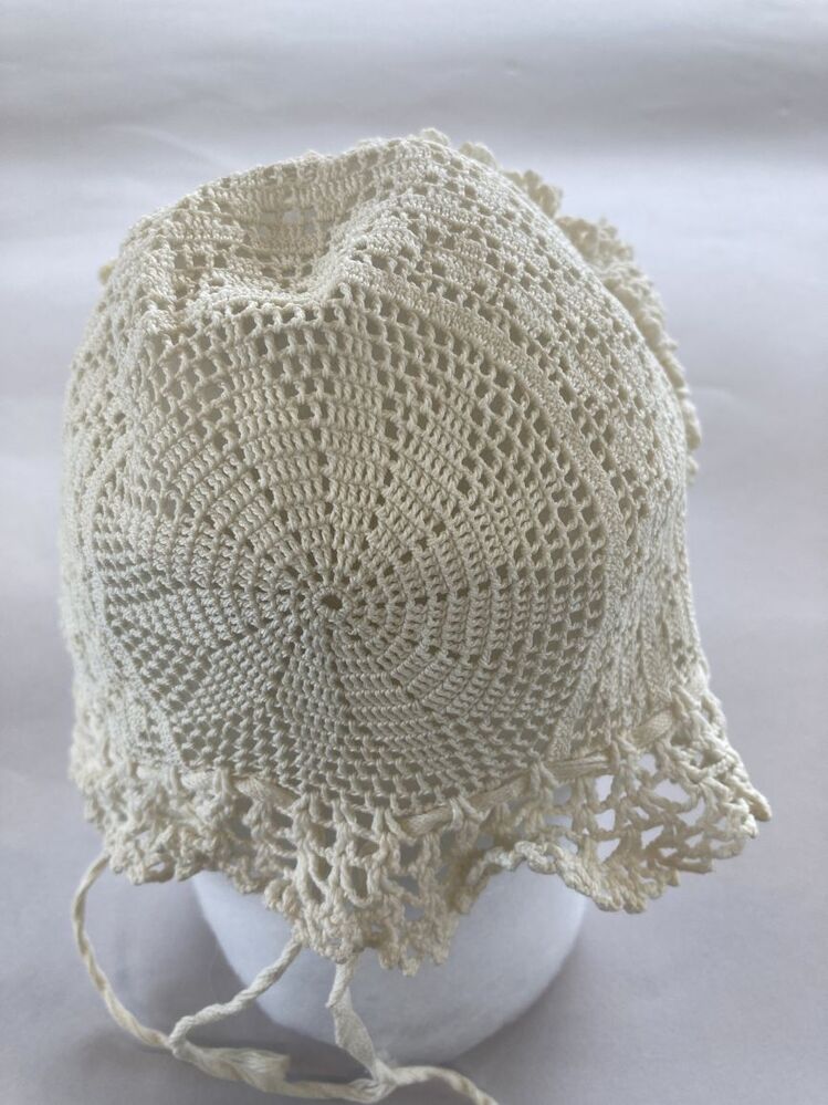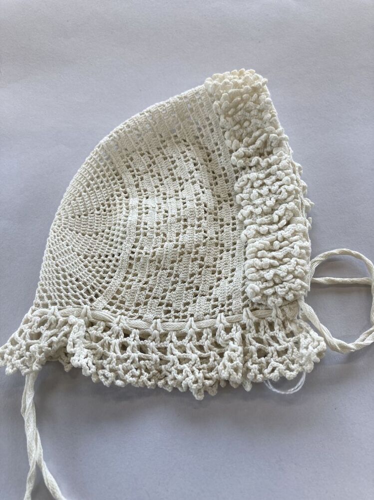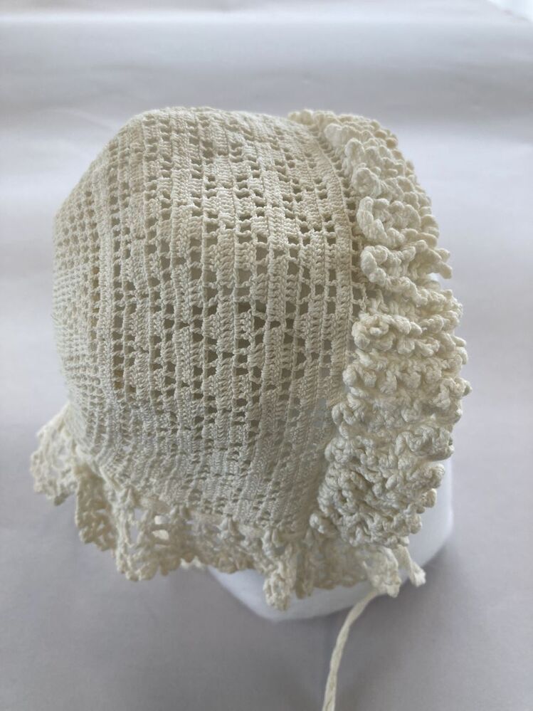 Gehaakt mutsje van wit katoen met twaalfpuntige ster, met hanekam met picootjes