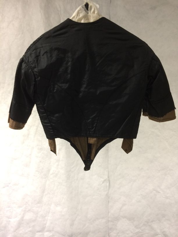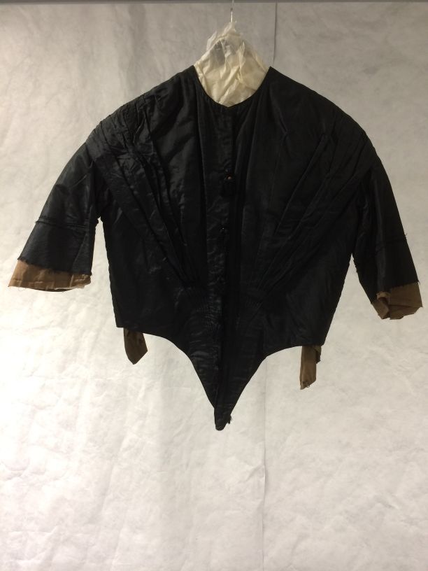 Zwart taftzijden kostuumjak zonder schoot en deel van mouwen, met kwastjes langs opening