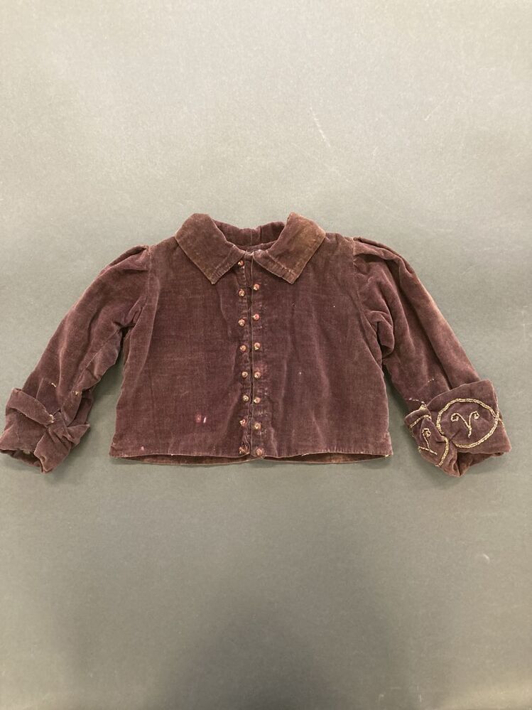 Jasje van donkerrood fluweel met kraag, versierd met knoopjes en galon