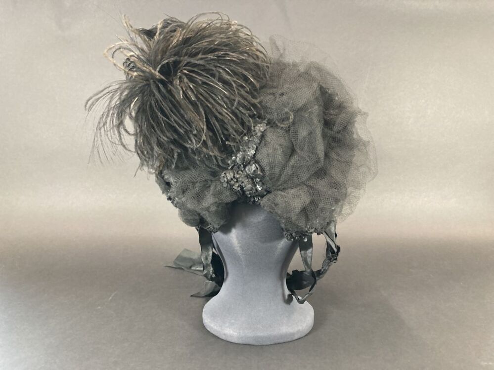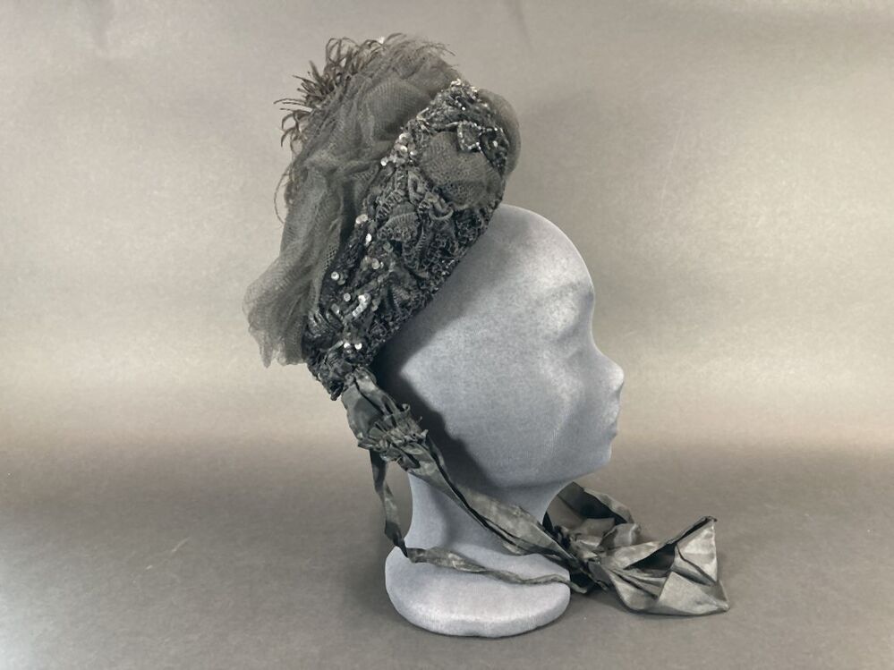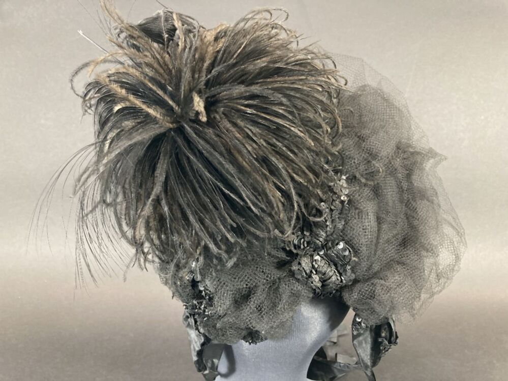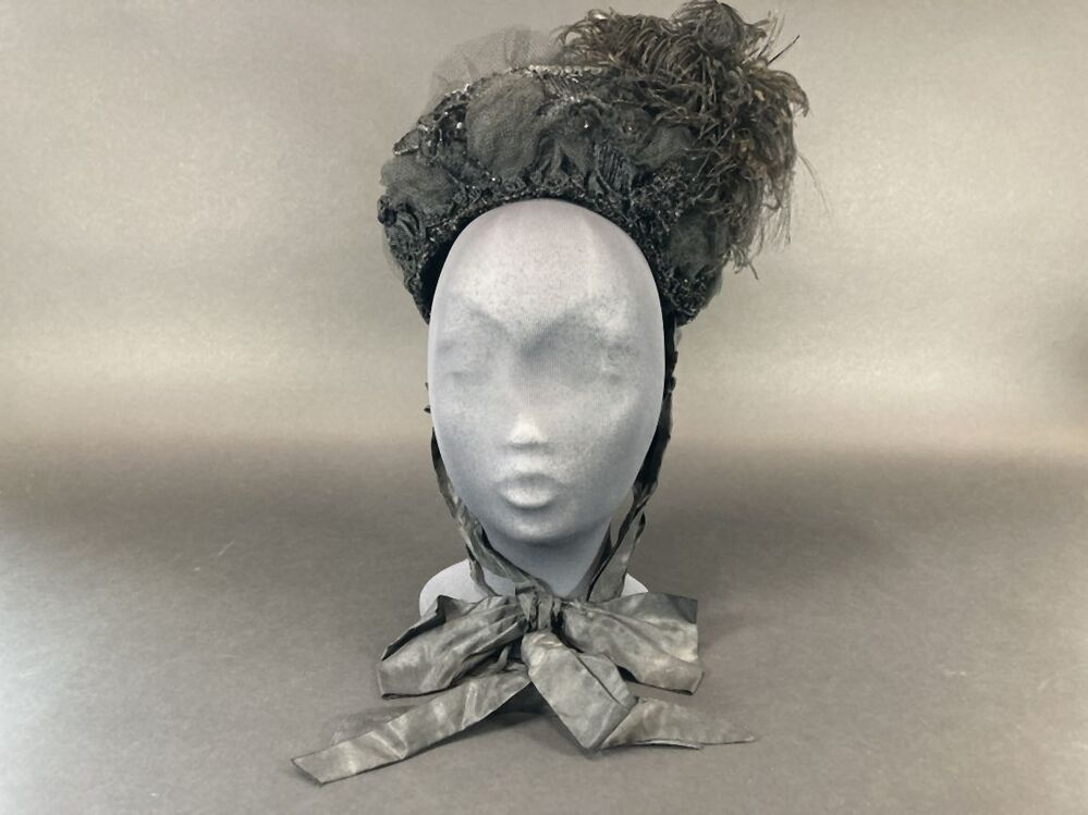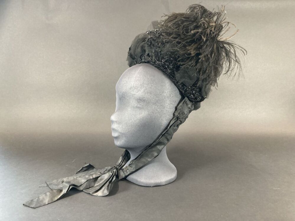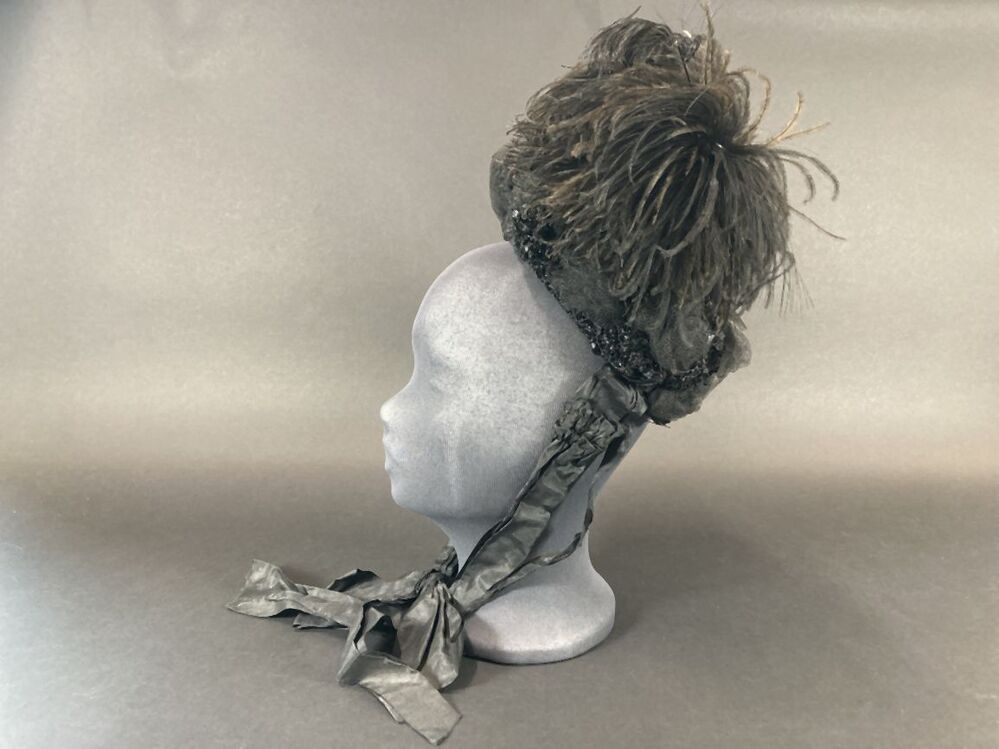 Kypske (hoedje) met zwarte veer en zwarte kraaltjes (rouwdracht)