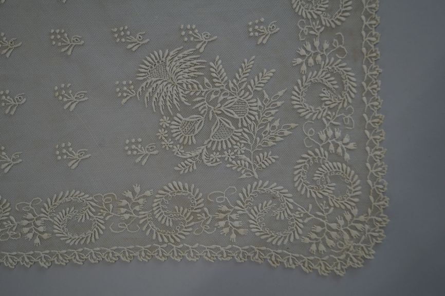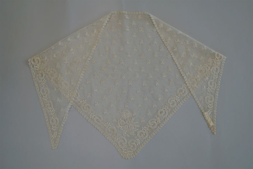 Fichu van wit benaaide tule met bessentakje en bladerrand
