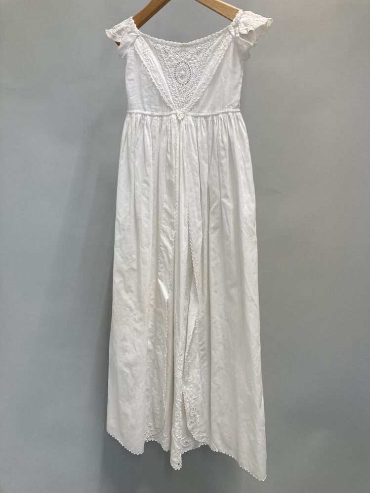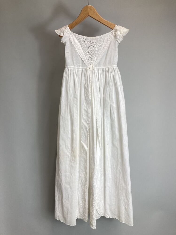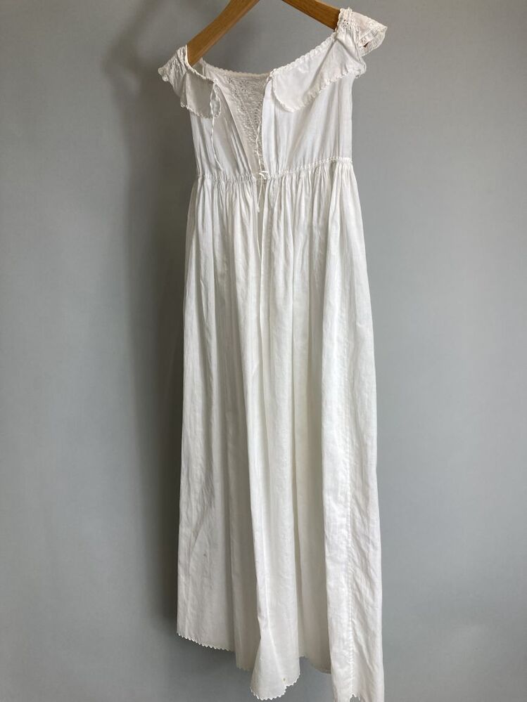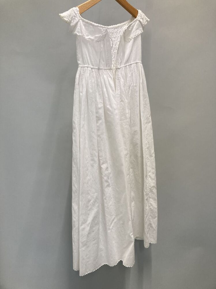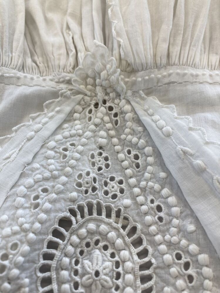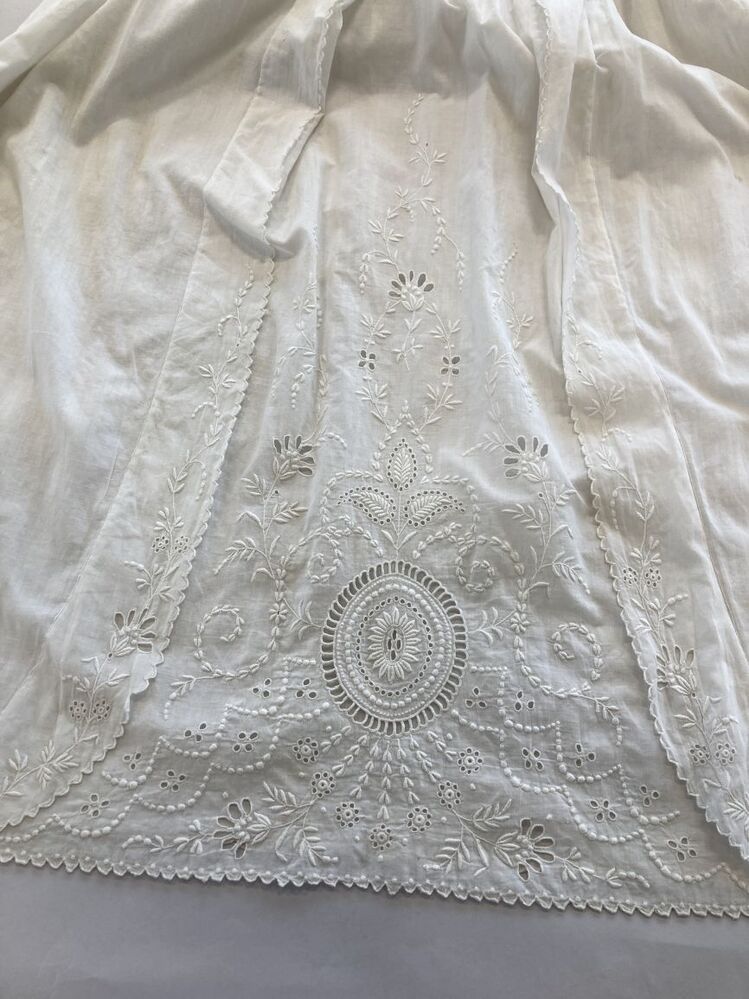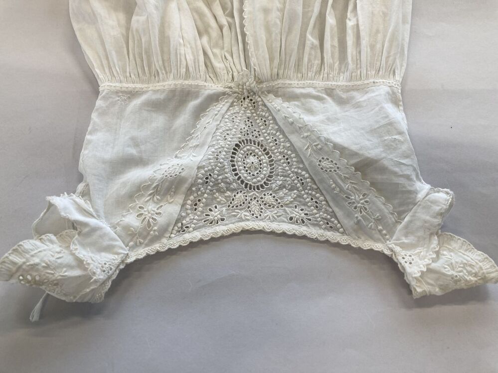Onderrok van witte katoen bij doop- of draagjurk, geheel gerimpeld aan een tailleband gezet