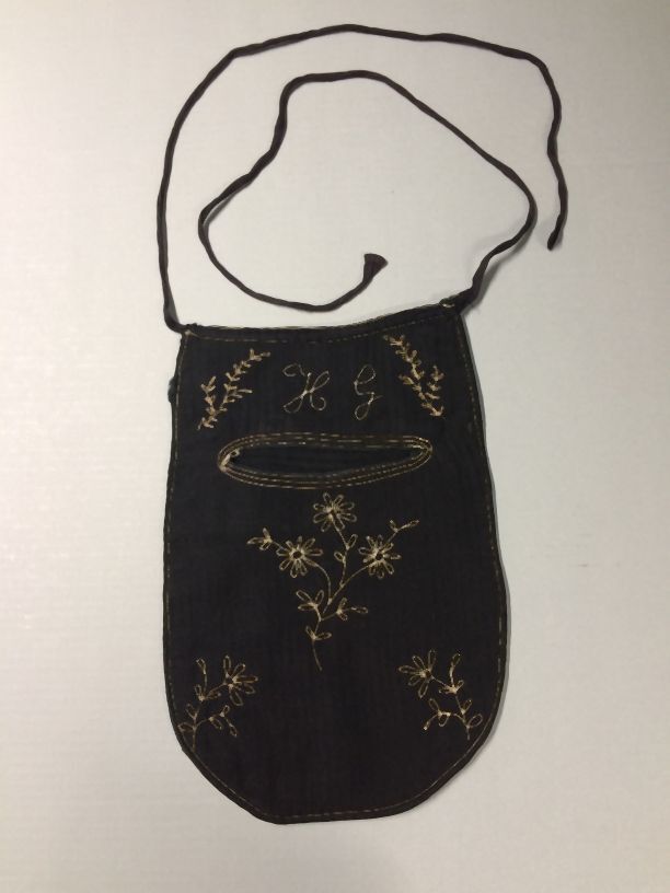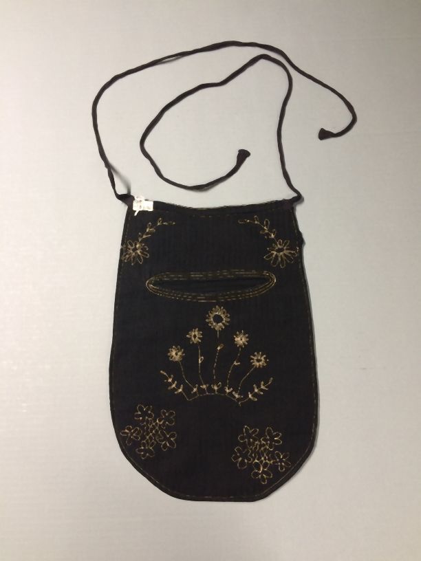 Zwarte wollen voorspanzak, geborduurd met witte bloemen en de initialen H G