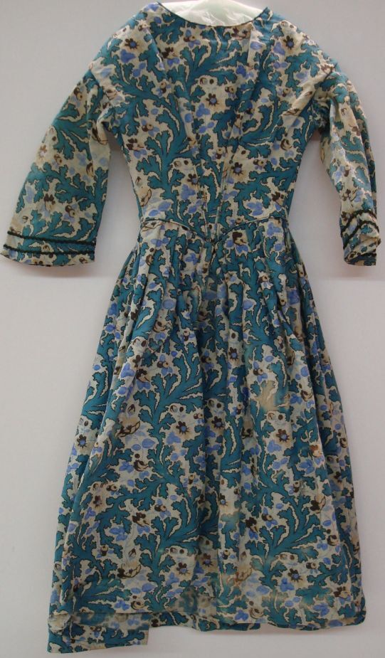 Blauwe Biedermeierjurk bedrukt met bladermotief in groen, bruin en lichtblauw, van wollen mousseline
