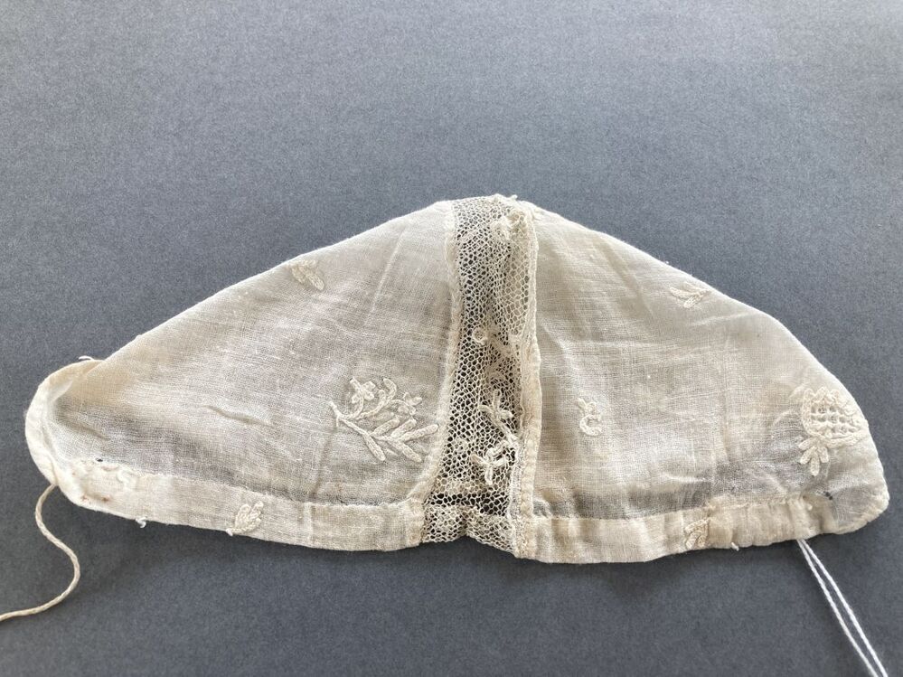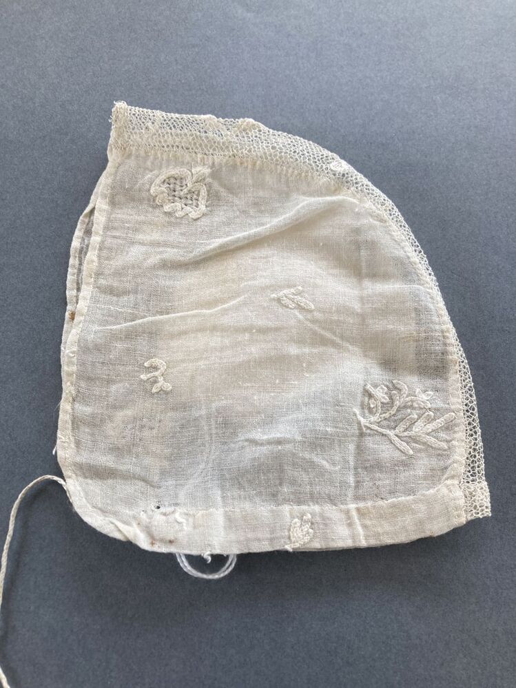 batisten kindermutsje met getamboereerde motiefjes en kloskant tussenzetsel