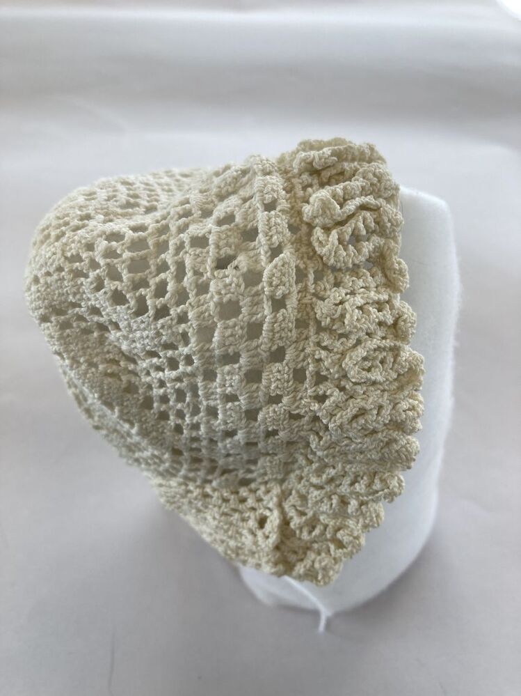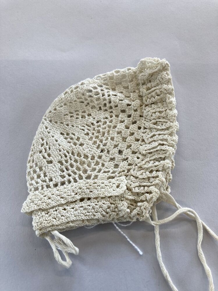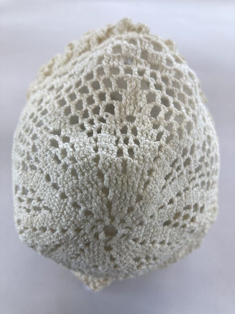 Wit katoenen gehaakt mutsje met een achtpuntige ster en hanekam