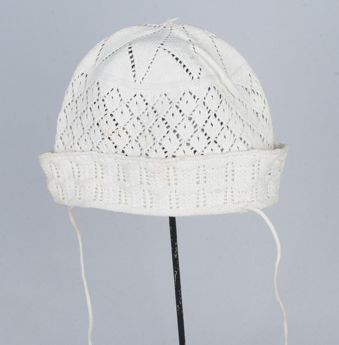 Wit katoenen gehaakte kindermuts, onderdeel van groep van vier