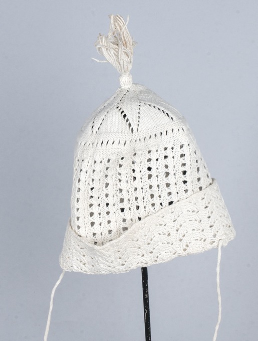 Wit katoenen gehaakte kindermuts, onderdeel van groep van vier
