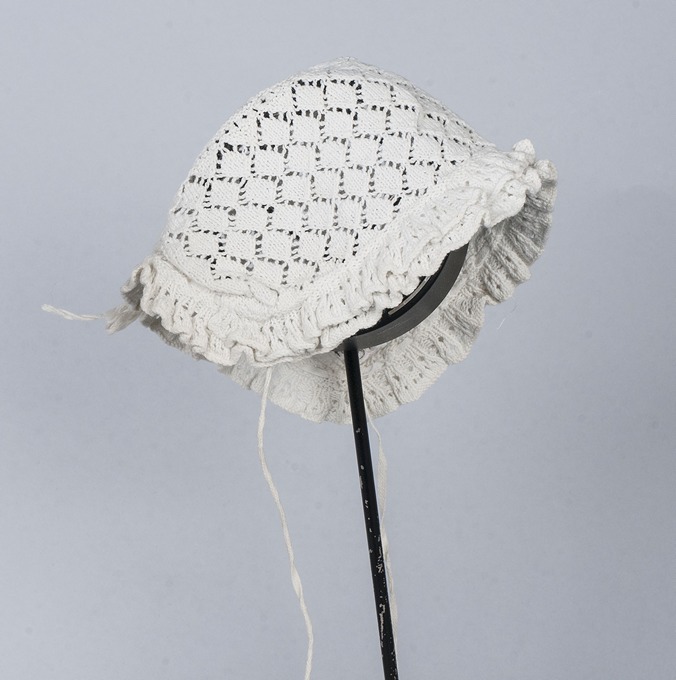 Wit katoenen mutsje ajour gebreid met ruches, onderdeel van groep van twee
