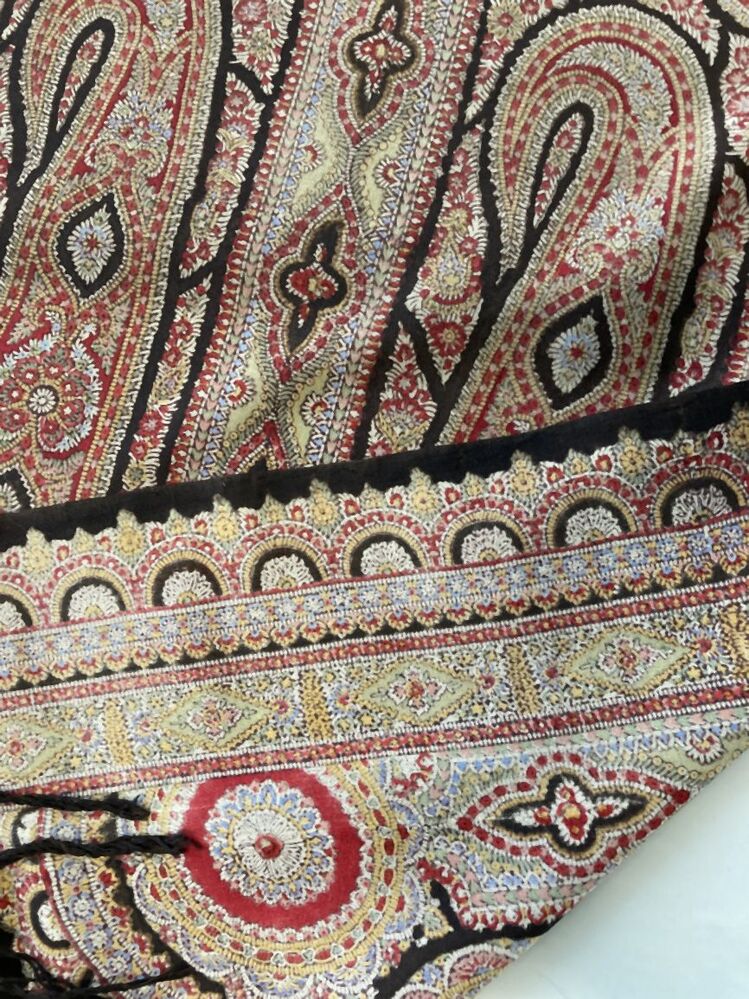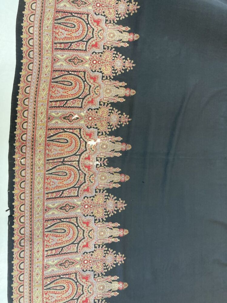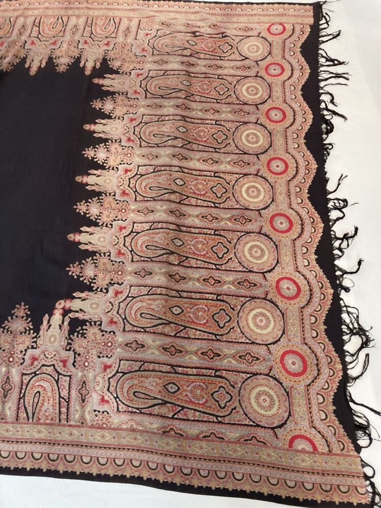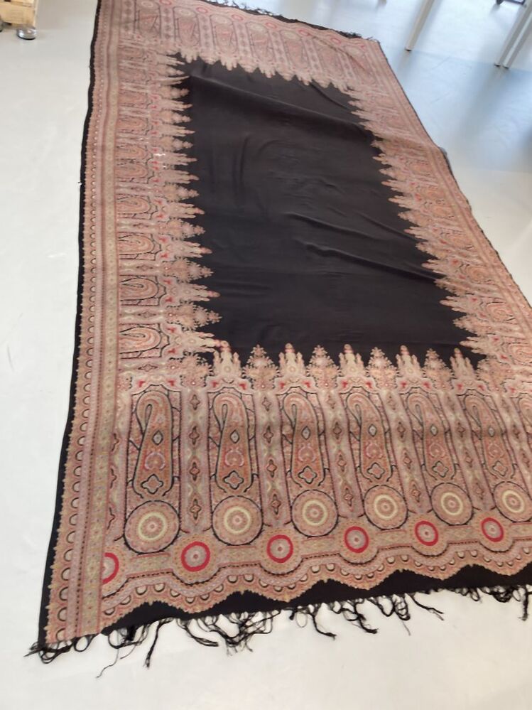 Omslagdoek van dunne bedrukte wol, fond is zwart, rand met grillige kasjmierfiguren en rozetten