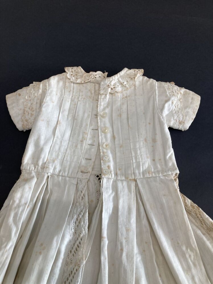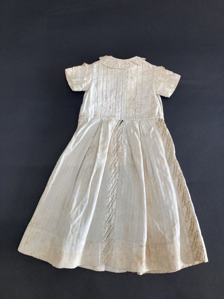 Jurk van wit gestreepte katoen met korte mouweb, afgezet met broderie