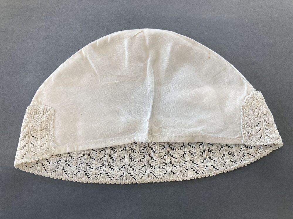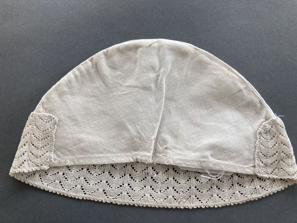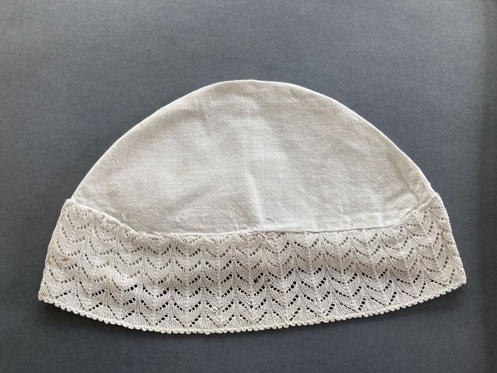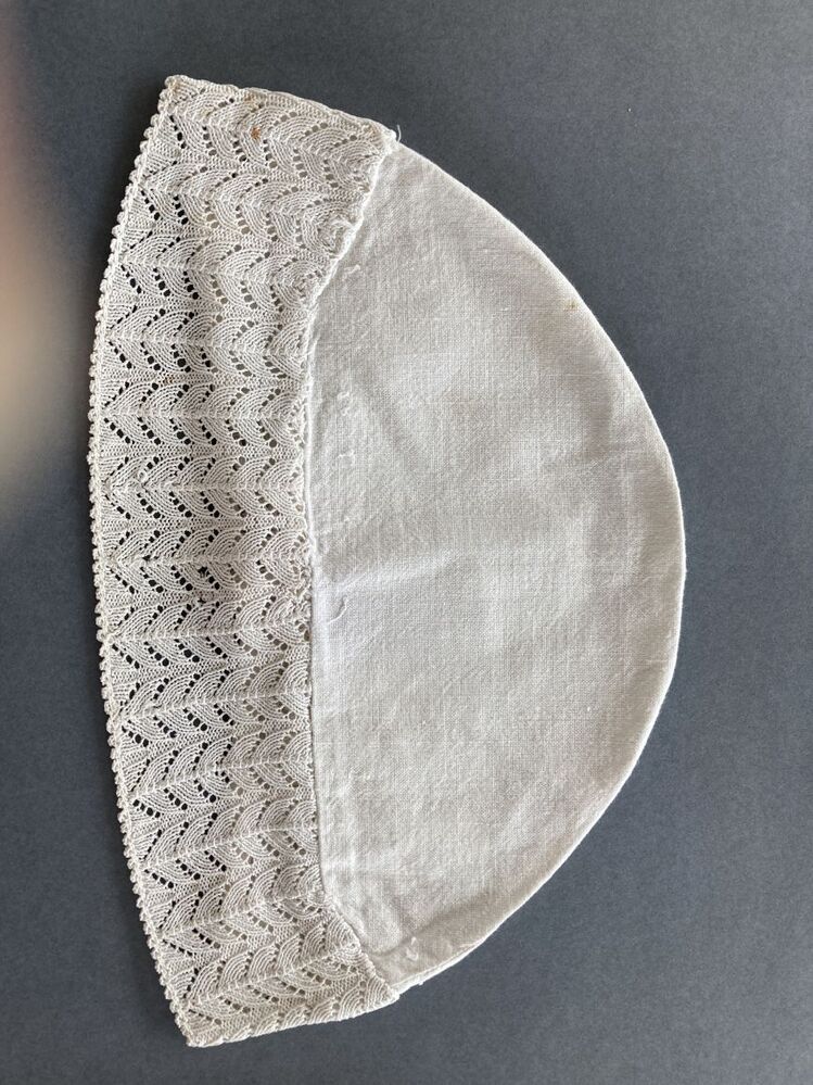 Witte katoenen ondermuts of tipmuts met ajour gebreide rand met geveerde takken