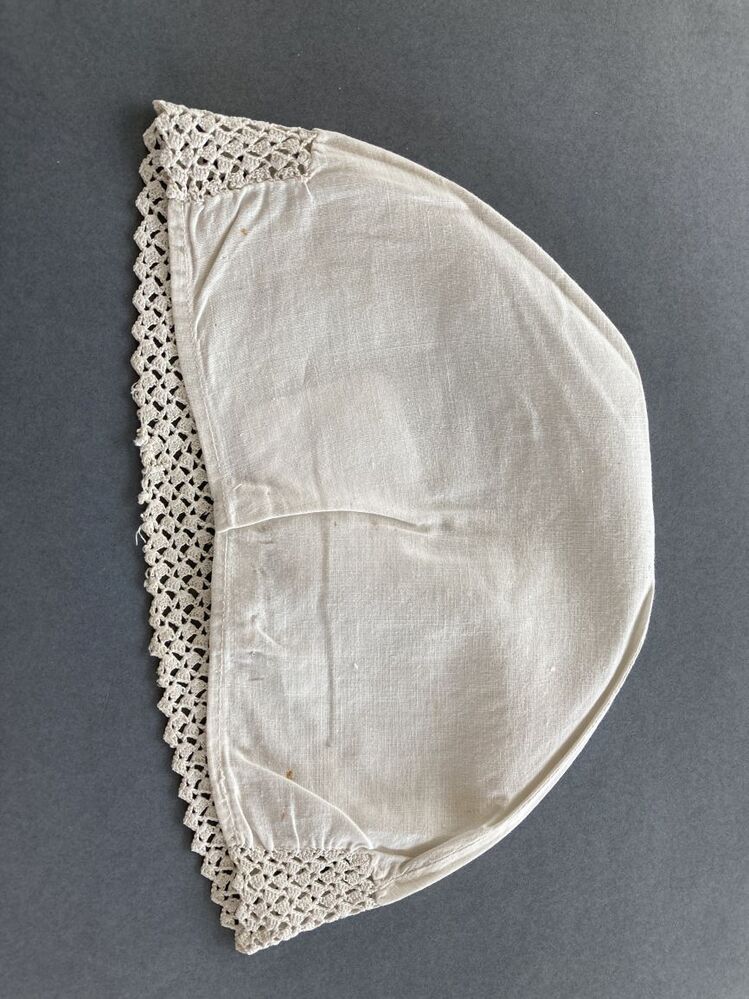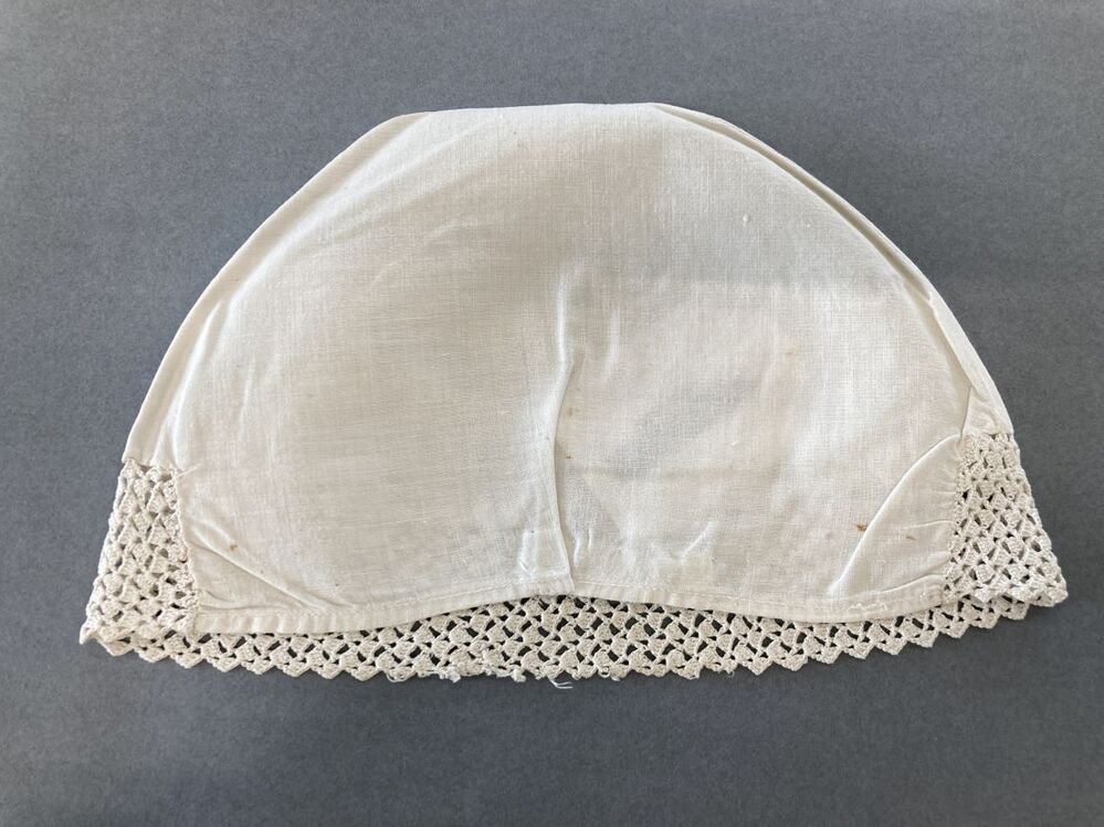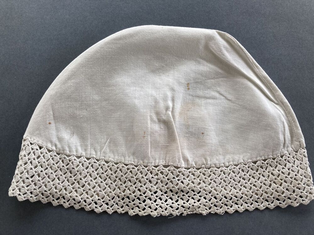 Witte katoenen ondermuts met gehaakte rand, met verspringende ajour blokjes