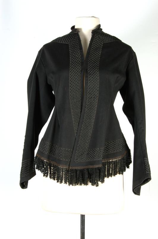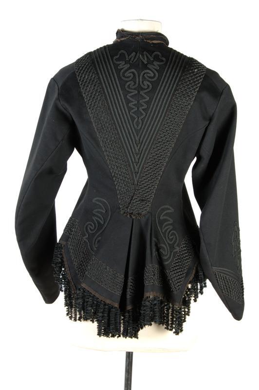 Zwart lakens jasje met queue, getailleerd, afgezet met motieven in veterband en breed galon