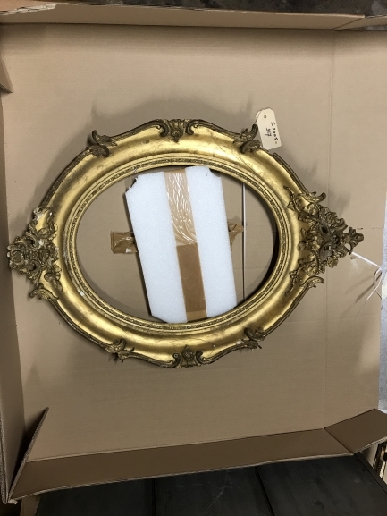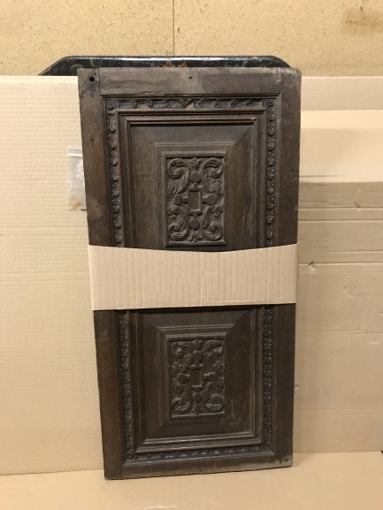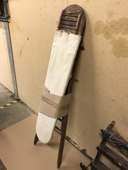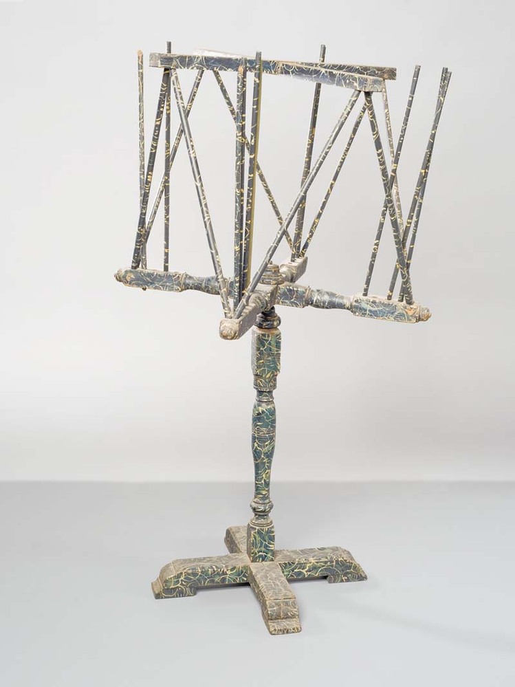 Grote blauwwit gemarmerde garentwijder van hout, de balustervormig gedraaide stam rust op een kruisvoet, op de stam draait de eigenlijke winder, enkele stokjes ontbreken