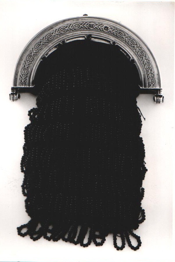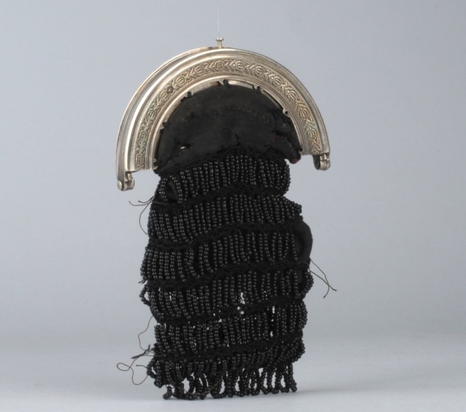 Aan beugel is lange rechthoekige tas van zwart katoen genaaid, versierd met horizontale banen van vertivaal geregen zwarte kralen