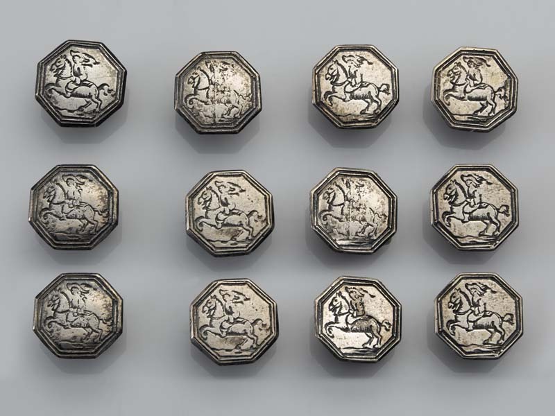 Twaalf achtkantige zilveren knopen, op de voorzijde met een ruiter gegraveerd