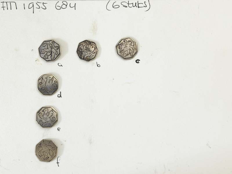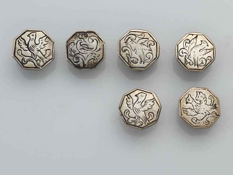 Zes achtkantige zilveren knopen, op de voorzijde gegraveerd met een vogel op tak