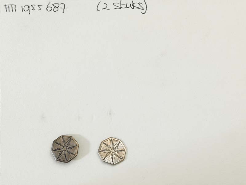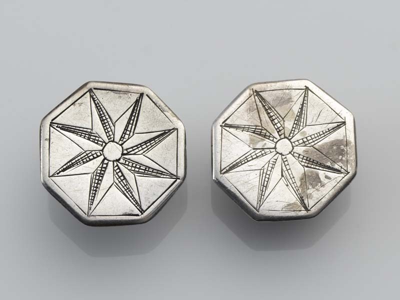 Twee zilveren achtkantige knopen, de voorzijden voorzien van een gegraveerde achtpuntige ster