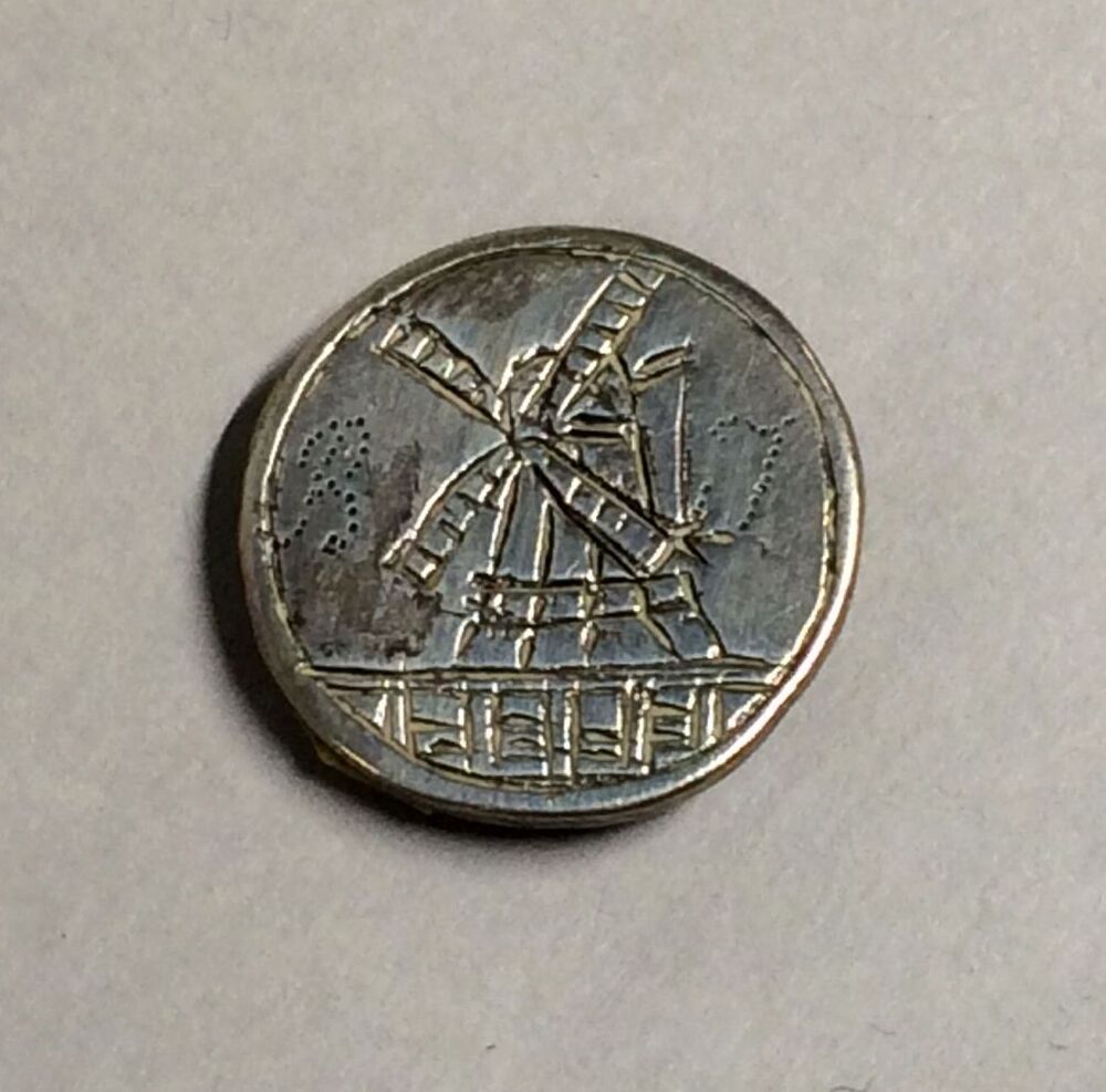 Ronde zilveren knoop, gegraveerd molentje met aan weerszijden letters BJ
