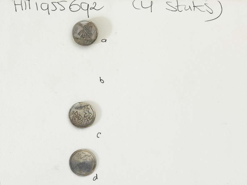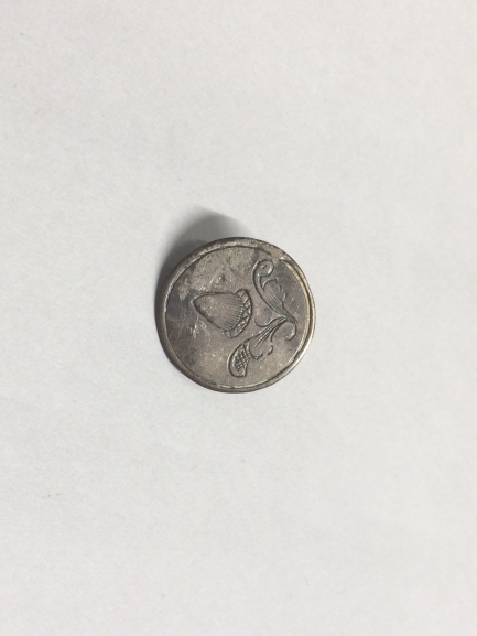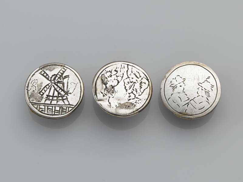 Ronde zilveren knoop, gegraveerd met eikel op takje