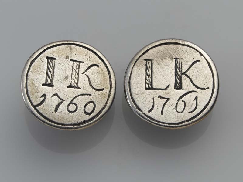 Twee platte, ronde knopen met achterop een oogje, met drukletters IK/1760 en LK/1761
