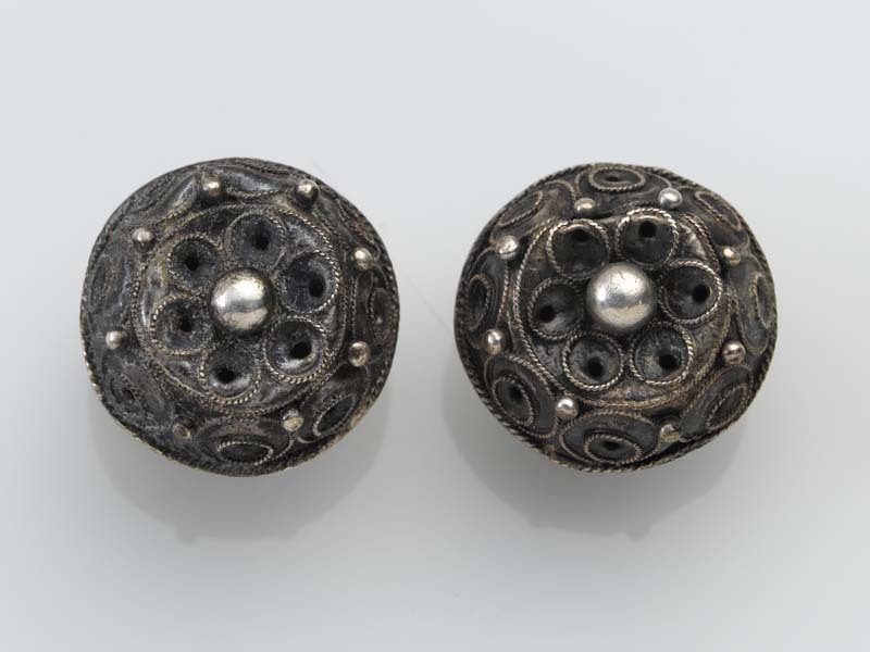 Twee halfbolvormige knopen met een koordrandje in het midden een grote bol met daaromheen zes doorboorde cirkels van koordband