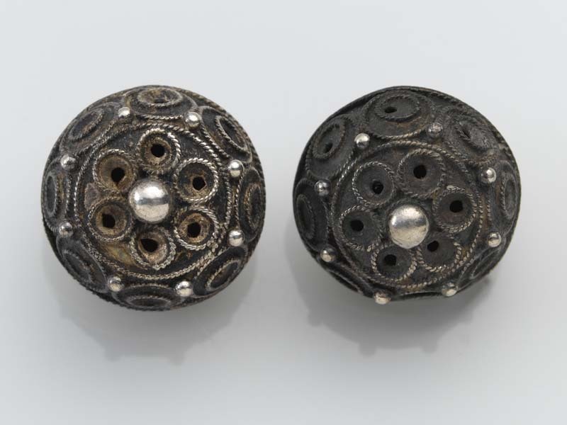 Twee halfbolvormige knopen met een koordrandje in het midden een grote bol met daaromheen zes doorboorde cirkels van koordband