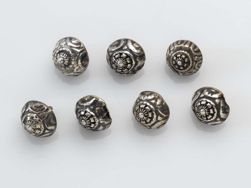 Zeven kegelvormige knopen met gedreven halve bloemen