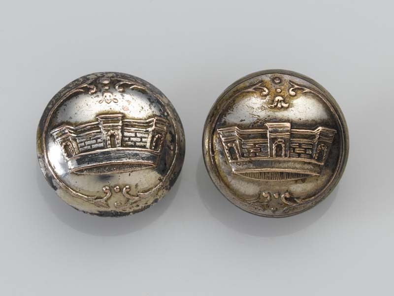 Twee knopen met oogje en bovenop een stadsmuren en poorten in de vorm van een kroon