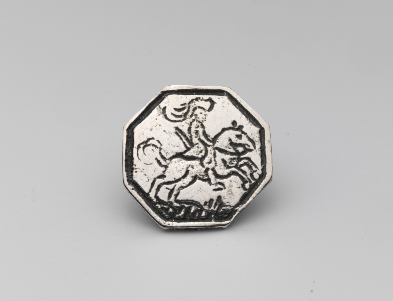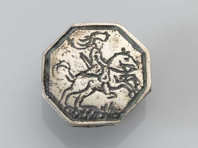 Platte achthoekige knoop met een ruiter te paard gegraveerd, galopperend naar rechts