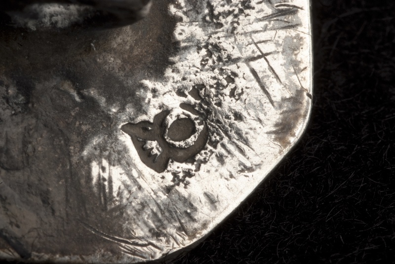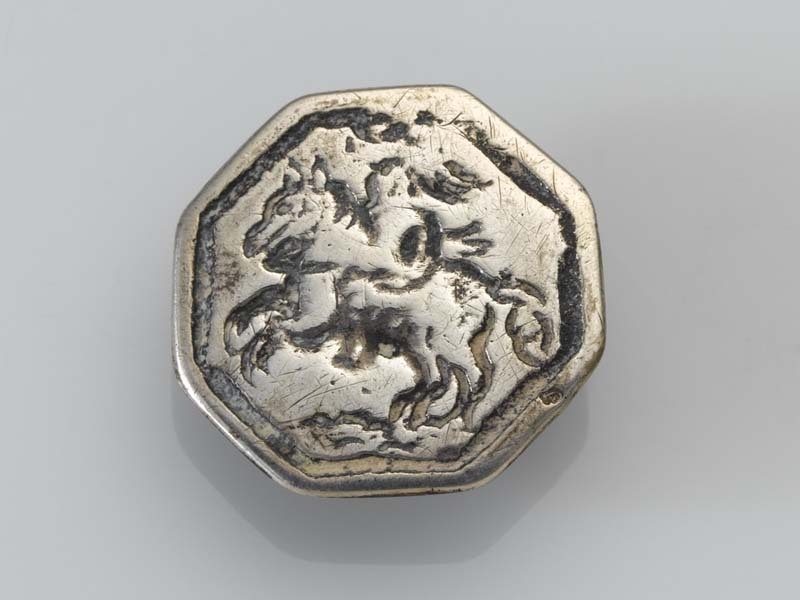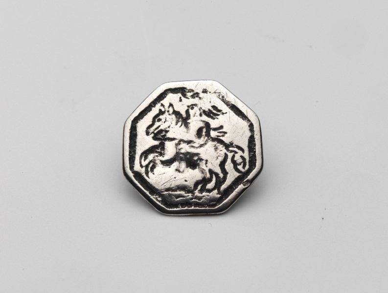 Platte achthoekige knoop een ruiter te paard gegraveerd, galopperend naar links