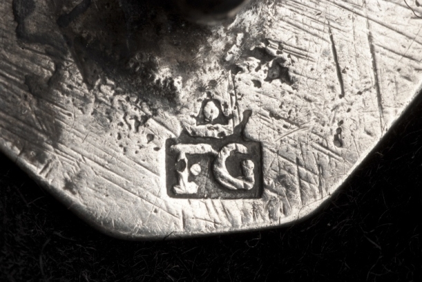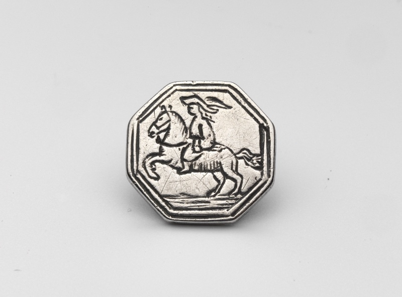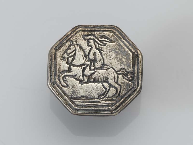 Platte achthoekige knoop met een ruiter te paard gegraveerd, galopperend naar links