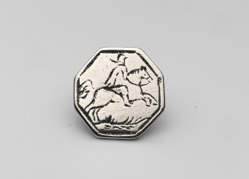 Platte achthoekige knoop met een ruiter te paard gegraveerd, galopperend naar rechts