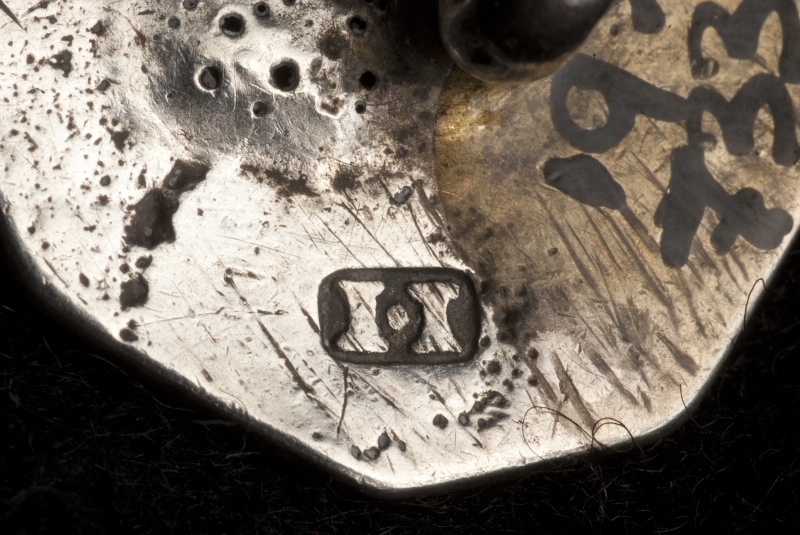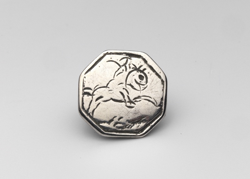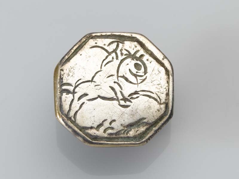 Platte achthoekige knoop met een ruiter te paard gegraveerd, galopperend naar rechts