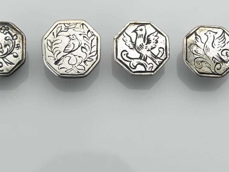 Vier verschillende platte achtkantige knopen met een gegraveerd vogeltje