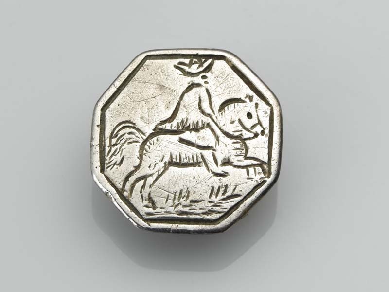 Platte, achtkantige knoop met een ruiter te paard gegraveerd, dravend naar rechts