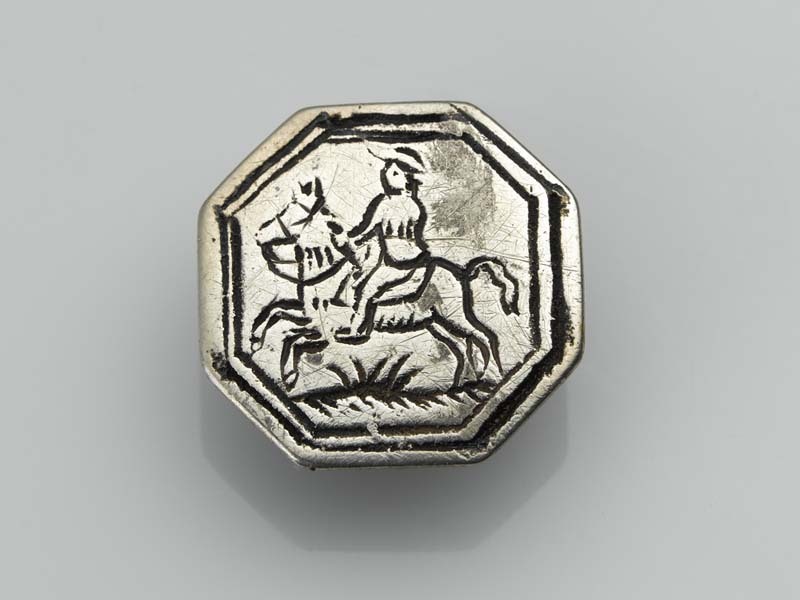 Platte, achtkantige knoop met een ruiter te paard