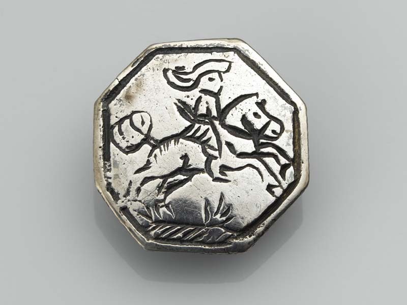 Platte, achtkantige knoop met een ruiter te paard