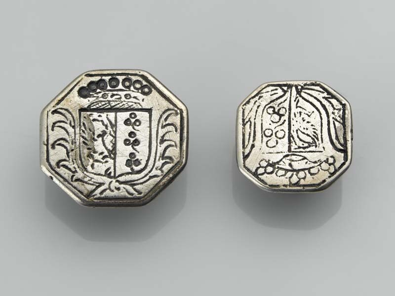 Twee achtkantige zilveren knopen, de grote heeft een gekroond wapenschild omgeven door lauwertakken de kleine bijna hetzelfde alleen twee klavers