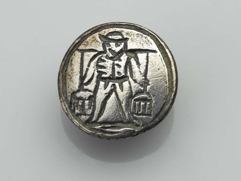Ronde, platte knoop met een staande boer met juk over de schouders, waaraan twee emmers hangen