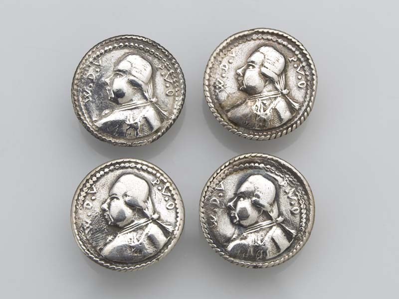Vier ronde zilveren knopen met in stampwerk de buste van Prins Willem de Vijfde, omgeven door dubbele parelrand