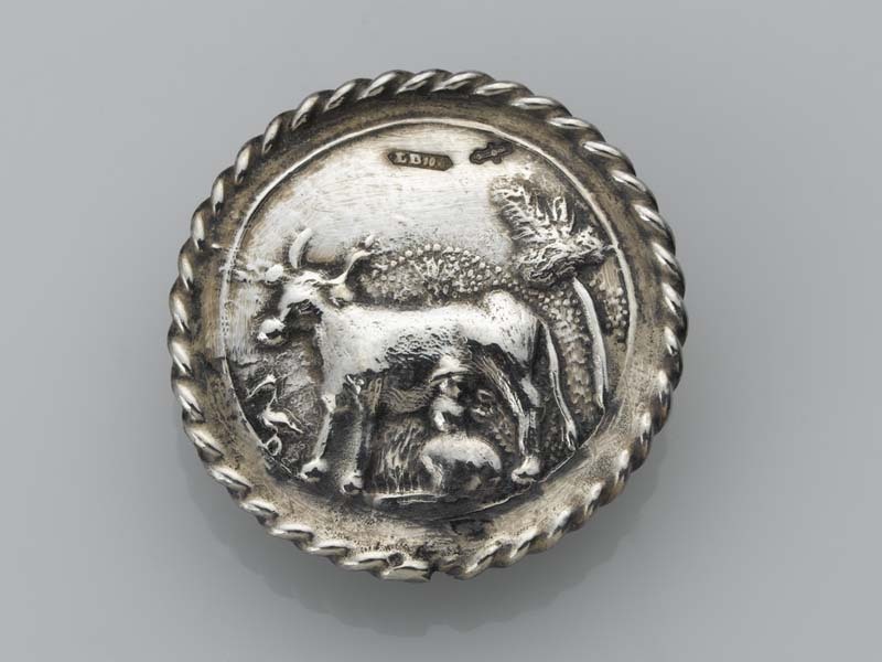 Platte, ronde knoop met een koe die door een boerin gemolken wordt, met links een ooievaar en rechts een boom